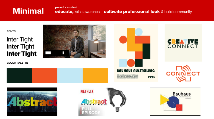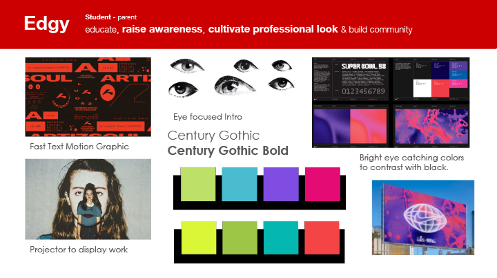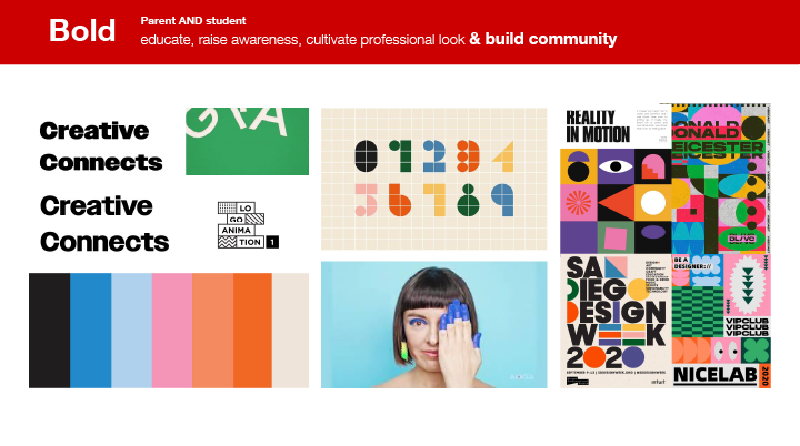 The project began with choosing a visual direction to move towards that aligned with both AIGA's visual style as well as one that connected with the target audience, that being both young and prospective designers, as well as their parents. Working with the clients, we created several visual directions in which to head in, and refined one based on their feedback.