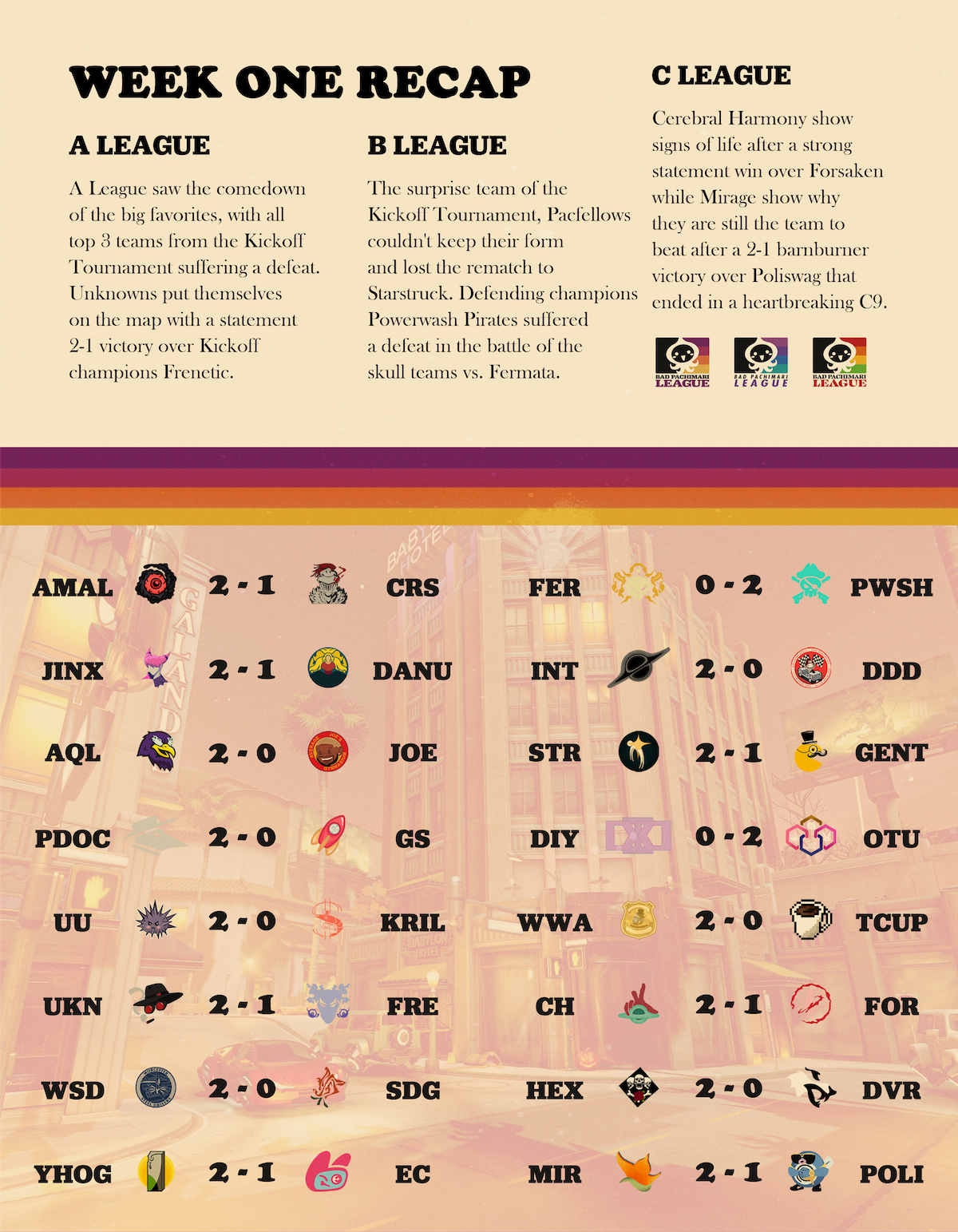 Starting in June, I lead the design team for the work on the upcoming season of the community-oriented league, Season 5, which focuses on the game Overwatch. This season, which consisted of three different skill divisions, and over 30 teams, needed graphics made for schedules, weekly graphics, and more.