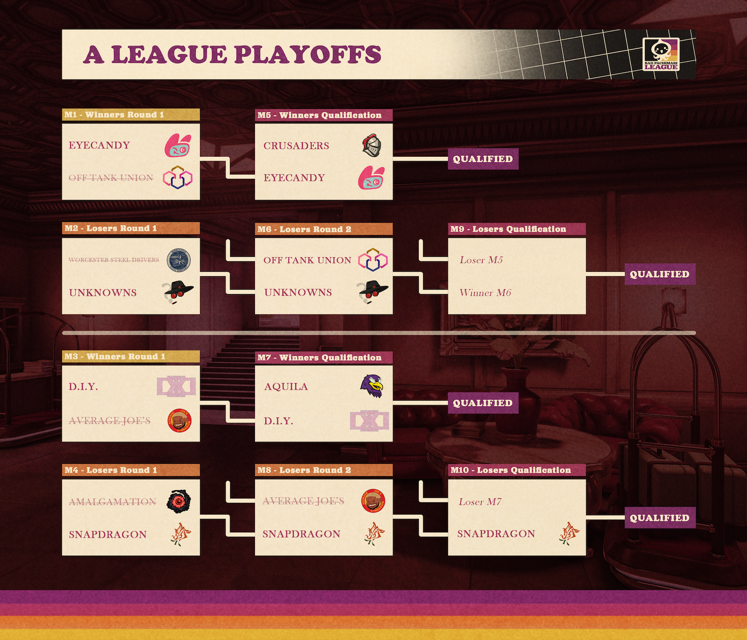 As the season's playoffs came to a close, champions were crowned. A graphic was made for each of these teams, and it was chosen that, rather than keeping the color palettes found throughout the season, creating a graphic that fit the team thematically while still referencing the 80s was the best way to create a graphic that really stood out and highlighted the seasonal champions.