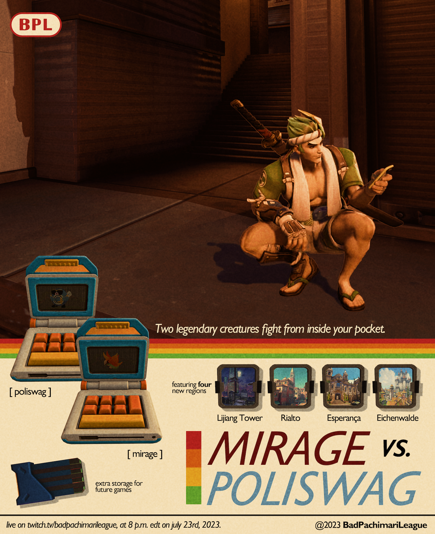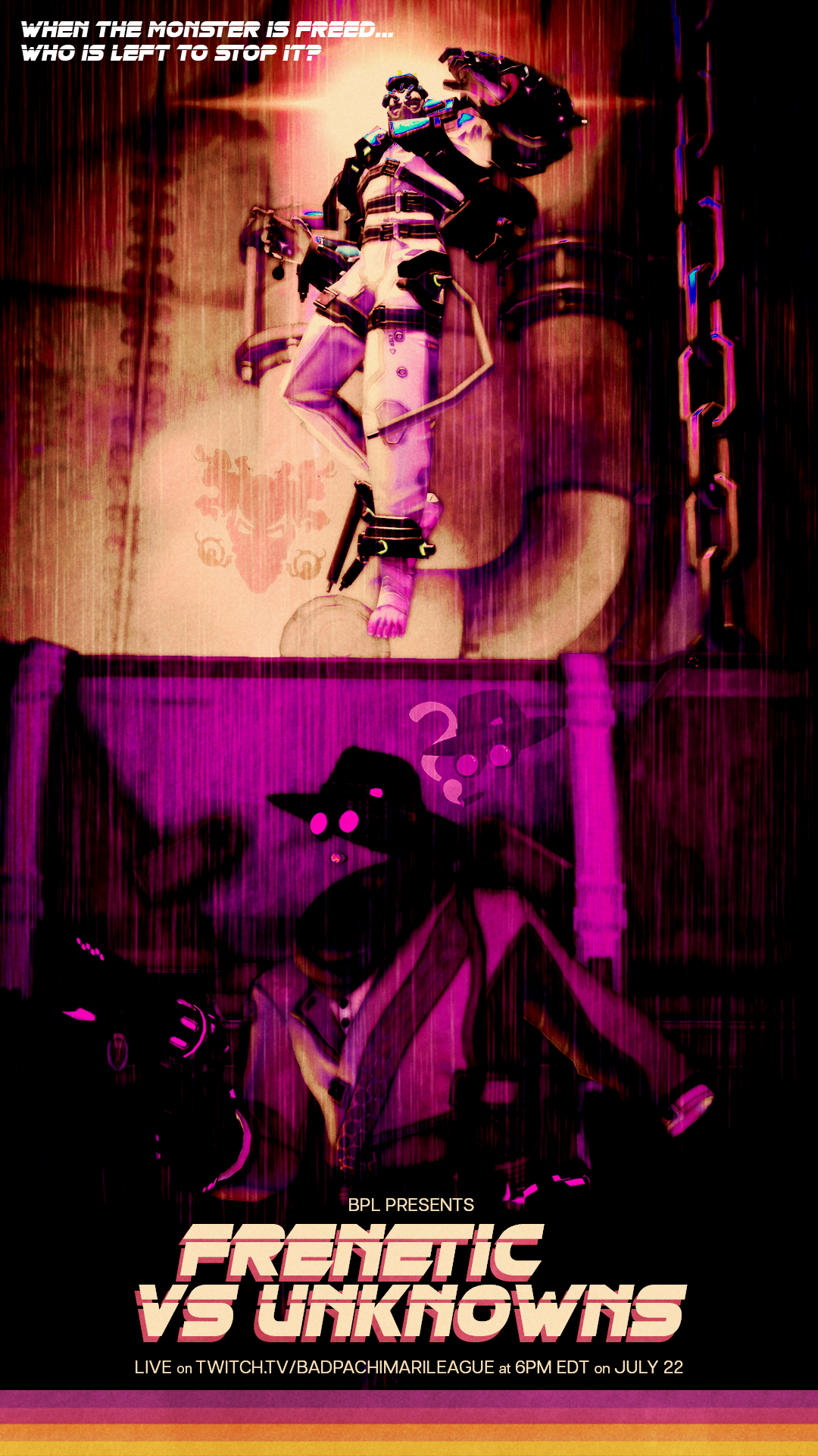 The other key graphics that needed to be created throughout the season were those for weekly highlight matches. Each week, one match from each league was highlighted and a graphic was created for it. These graphics were often directly in reference to an advertisement, poster, or other graphic from the 80s. These graphics were often made with in-game assets such as characters, maps, and digital assets found throughout the game. I was careful to ensure that when choosing these things, they all aligned with both the theme as well as the intent behind the graphic.