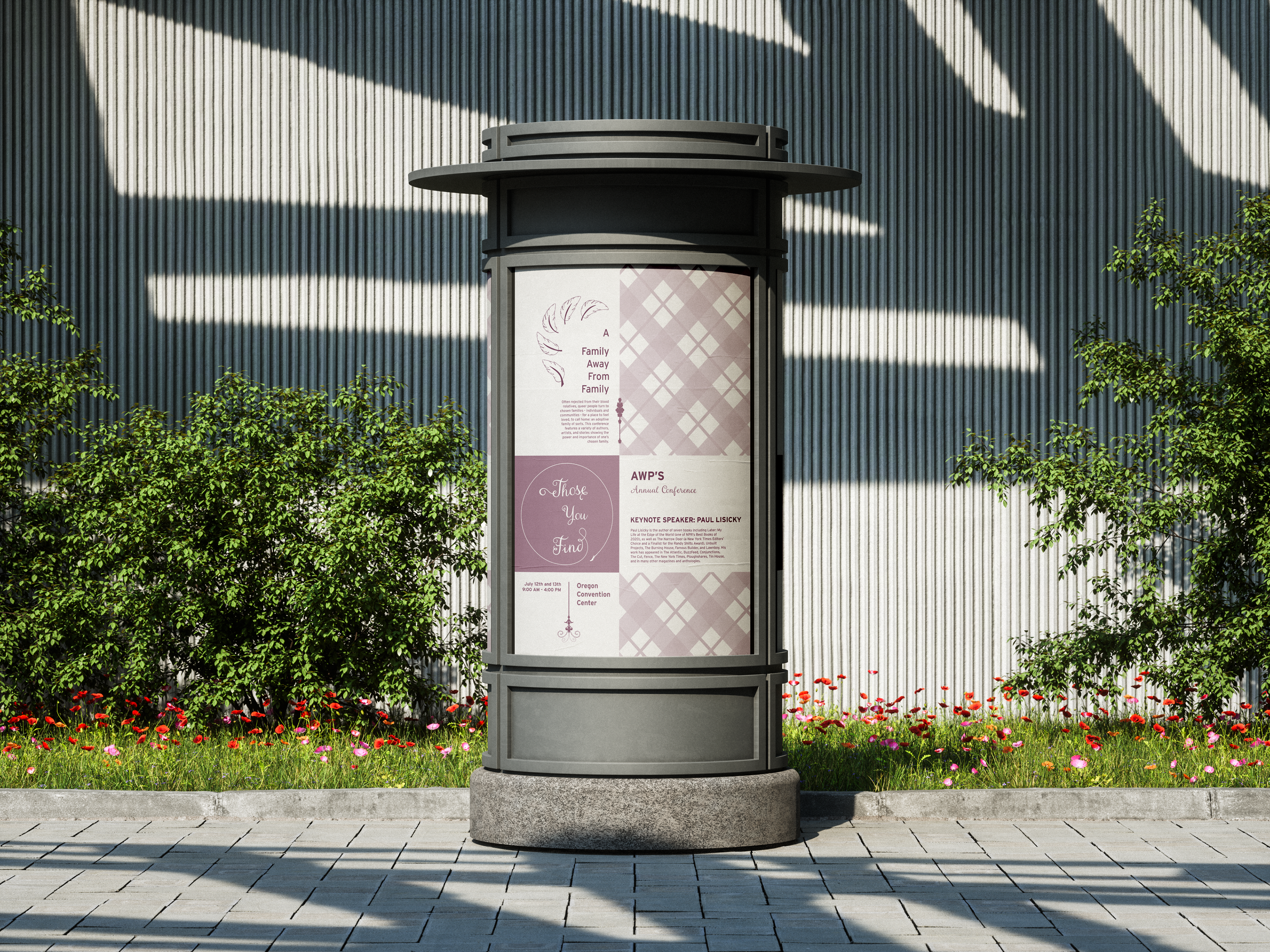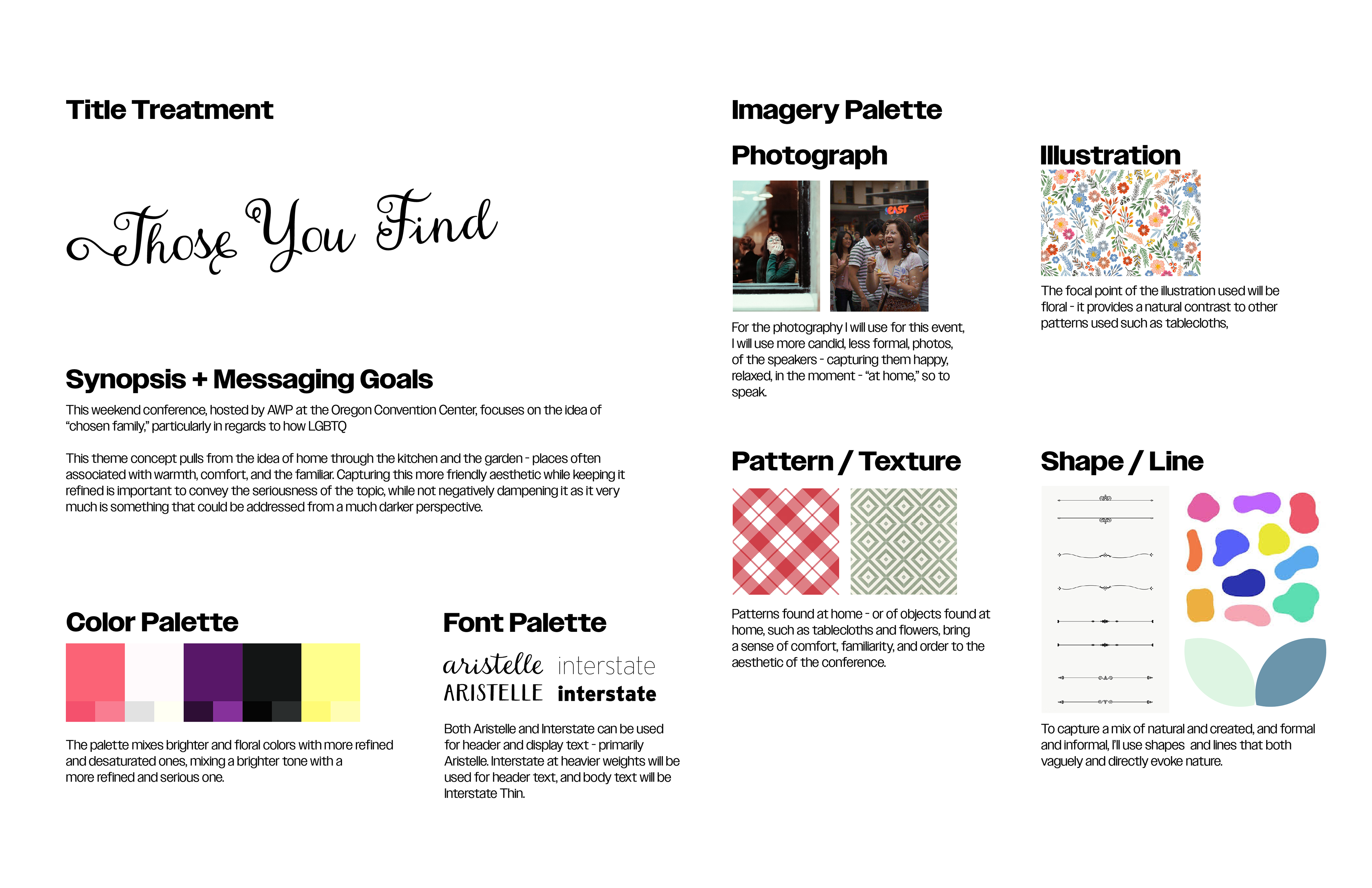 The theme for this year’s conference was “Those You Find,” focusing on the idea of found family. On top of a cohesive brand identity and visual system, a variety of materials, including a promotional booklet, posters, wayfinding, and other miscellaneous graphics and materials were required.