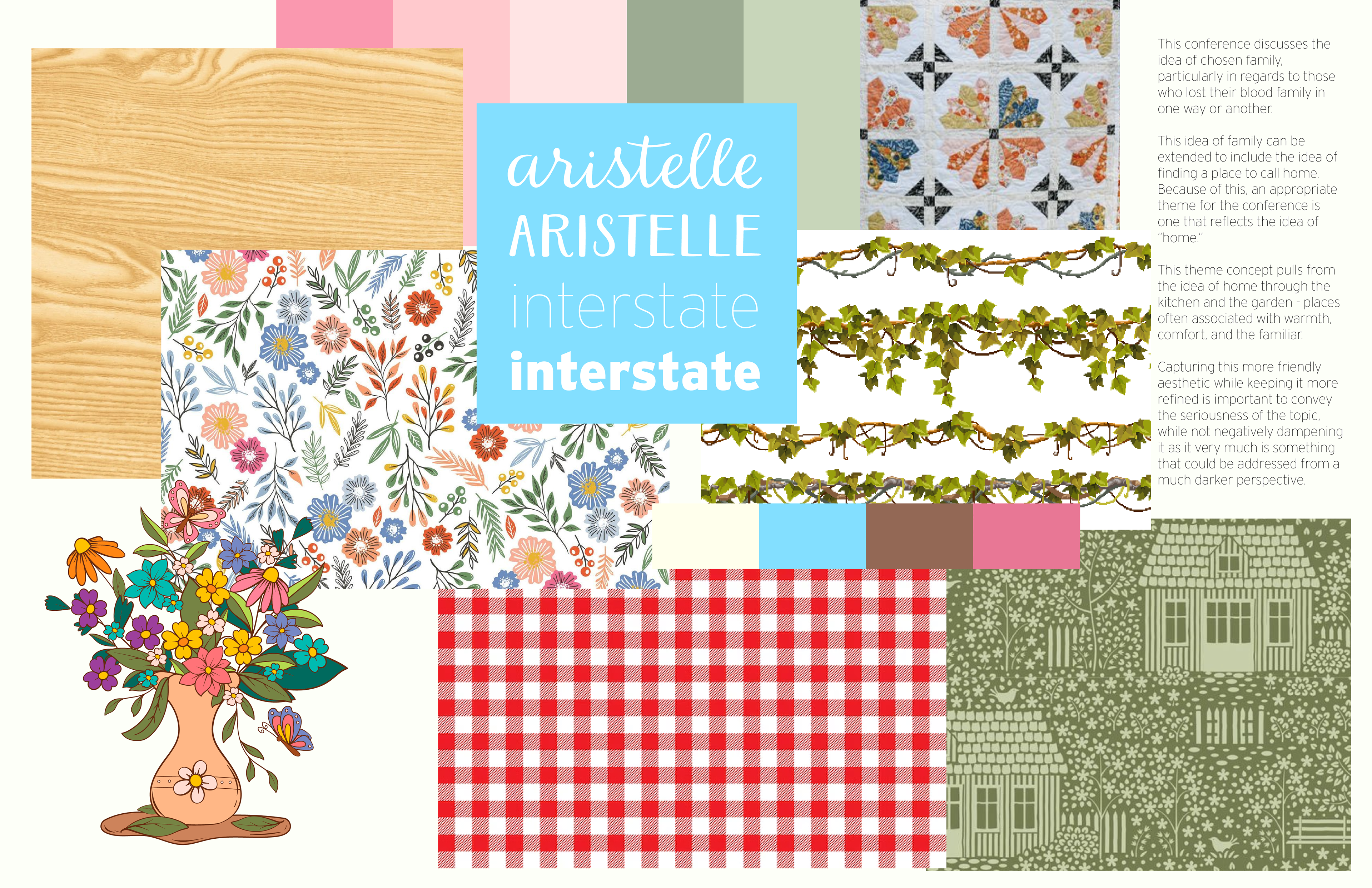 The primary challenge for this project was on deciding how the theme of the conference could be captured by its visual identity. This problem was solved with researching the target audience for the conference. In identifying that in the idea of a “found family” implied finding a place to call home and that would resonate with the audience, I decided on finding a theme that would visually represent the idea of home - through tablecloth patterns, and visual elements further evoking a sunlight kitchen full of plants - a comforting place to many.