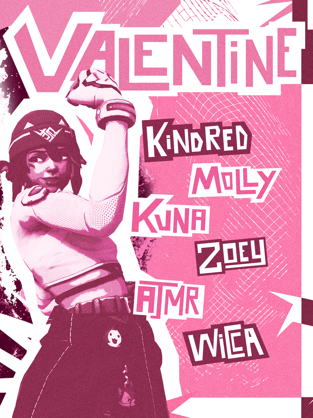 Graphics for Valentine were developed with a brand system in mind, creating a color palette and visual style that was varied between different events, as shown below, all while maintaining an overarching consistency to the brand.